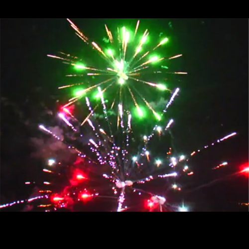 Красные кометы разрываются на пионы с крупным синим, зеленым, красным и пурпурным жемчугом. Парчовая пальма с яркими синими и зелеными звездами переходящая в цветную трещащую хризантему. Яркий совокупный финал.
